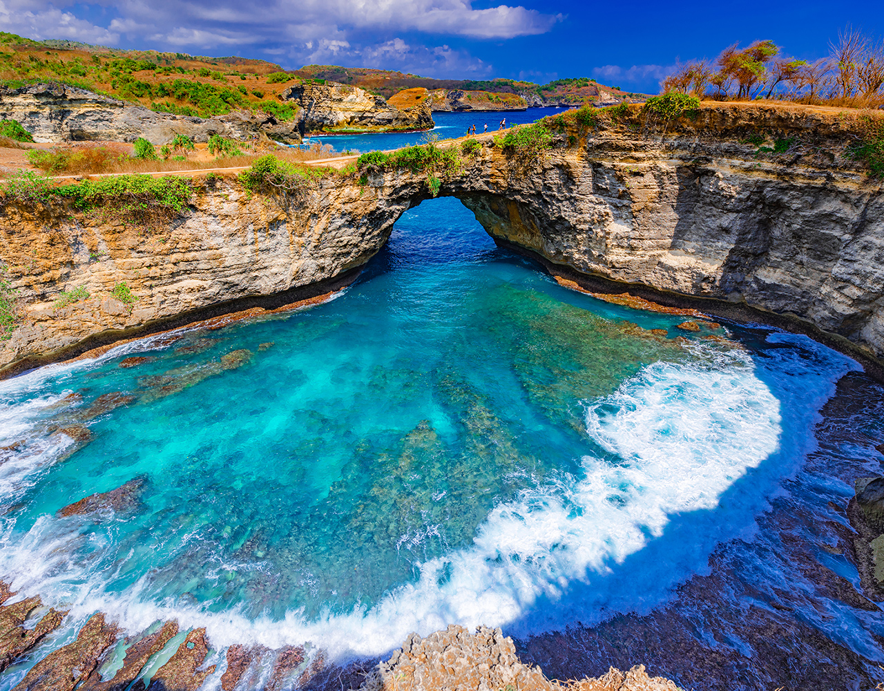 Start your day with a hotel pickup and transfer to Sanur Harbor. Board a fast boat to Nusa Penida and be greeted by your driver upon arrival. Head to Kelingking Beach to see the rock formation that looks like a dinosaur.